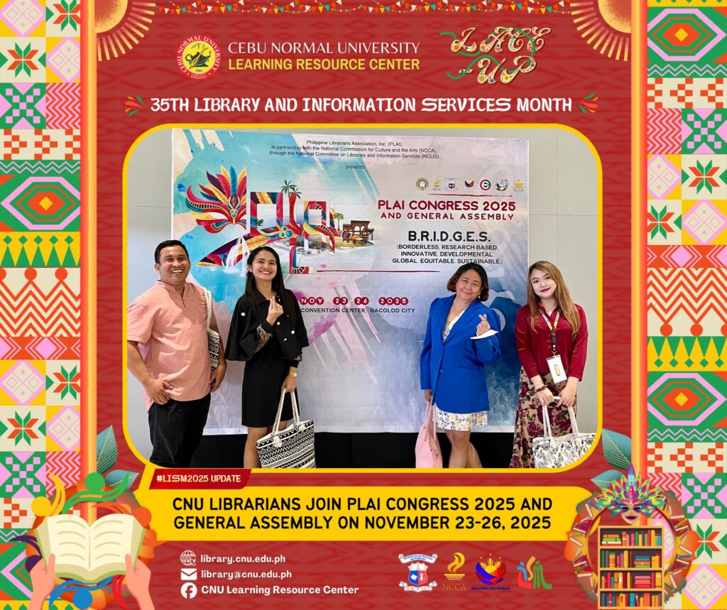 CNU LRC Librarians headed by the OIC-Supervisor, of the Library Services, Ms. Francheska Vonne S. Gali, goes to PLAI National Congress and General Assembly 2025. The theme for this yearβs Congress is: “PLAI BRIDGES: Borderless. Researchβbased. Innovative. Developmental. Global. Equitable. Sustainable,” held at the SMX Convention Center, Bacolod City.