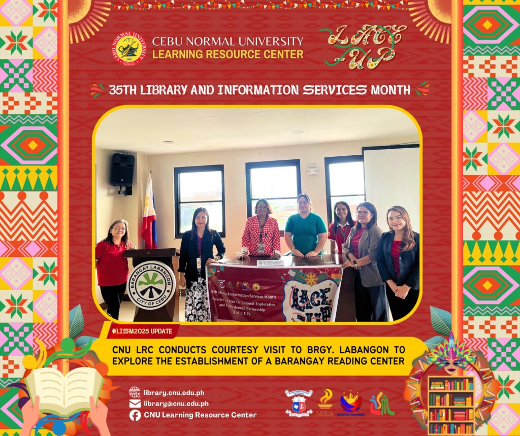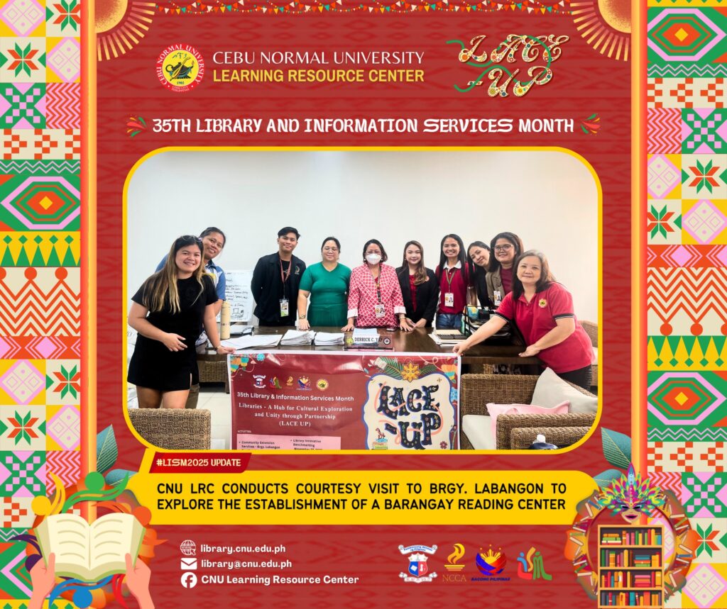 As part of the Library and Information Services Month (LISM) 2025 celebration, the CNU Learning Resource Center, together with the BLIS and MLIS Departments, conducted a courtesy visit at Brgy. Labangon Hall to present plans for a proposed Barangay Reading Center. The team also carried out a needs assessment survey to understand the communityβs literacy priorities.