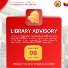 ย ๐๐๐๐ฅ๐๐ฅ๐ฌ ๐๐๐ฉ๐๐ฆ๐ข๐ฅ๐ฌย Pursuant to Proclamation No. 727, Series of 2024, declaring December 8, 2025 as a special non-working day, the library will be closed on the said date to celebrate the Feast of the Immaculate Concepcion.ย Access our online services atย library.cnu.edu.phThank you Continue Reading