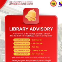 ย ๐๐๐๐ฅ๐๐ฅ๐ฌ ๐๐๐ฉ๐๐ฆ๐ข๐ฅ๐ฌย Please be informed that the CNU LRC will be closed on the following dates:ย October 31, 2025 (Friday) โ Special Non-Working Holiday (Presidential Proclamation No. 727)ย November 1, 2025 (Saturday) โ All Saintsโ Dayย Access our online services atย library.cnu.edu.ph.Thank you and have Continue Reading